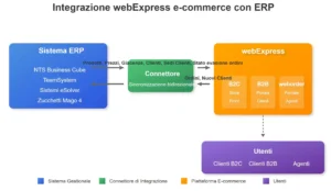Utilizzo combinato di WebExpress per B2B e Shopify per B2C, con gestione unificata dal gestionale.